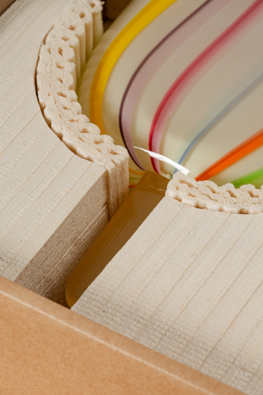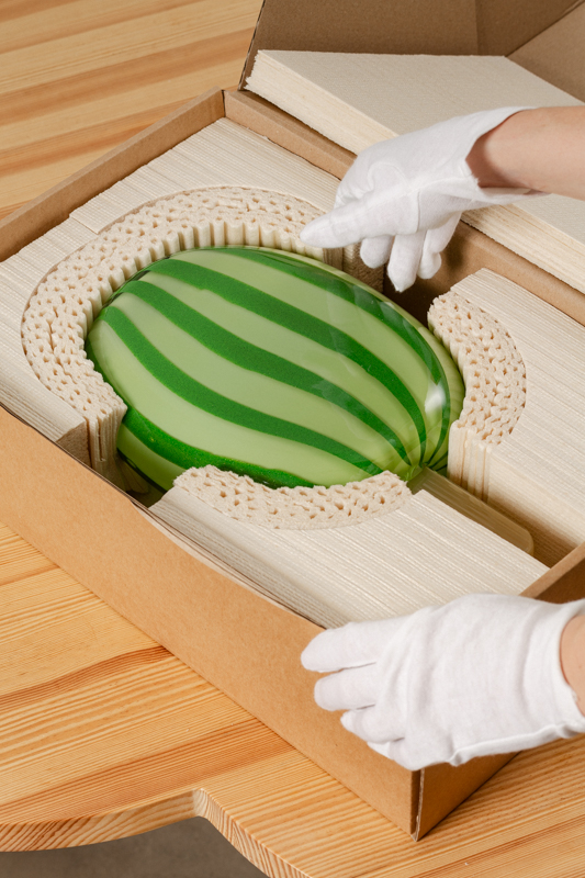 Woamians are proud to announce yet another challenging, but fun packaging project for the popular popsicle sculptures from Pau La Design. These pieces of art from the Finnish designer Paula Pääkkönen have been featured for example at Benetton shop windows in Milan. No two popsicles are the same since glass blowing gives each piece slightly unique size and shape. Therefore, it was important to find a way to make the solution easily adjustable to different sizes of popsicles so that the packing experience would be significantly more efficient for Paula and her team, as well as create a pleasant unboxing experience for the end customer.
