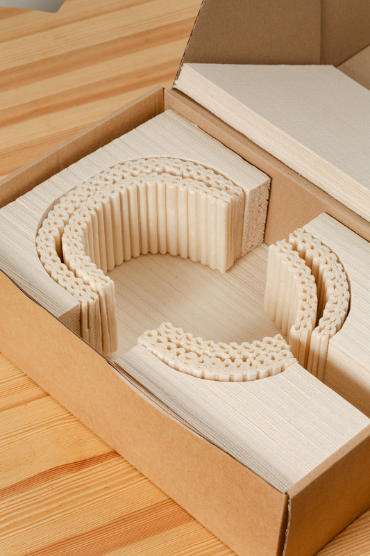 “When developing this package, beyond the technical aspects we also considered the poetic and sensorial aspects of the packaging. The Woamy biofoam, a soft, warm, light, airy and organic material, creates a striking contrast with the artwork, a shiny, fragile, cold, heavy and rigid object - highlighting its unique character and emphasizing its values. The artwork is surrounded by a soft, protective, and safe frame, underlining how precious it is.” Reflects Imola Balogh, designer at Woamy.